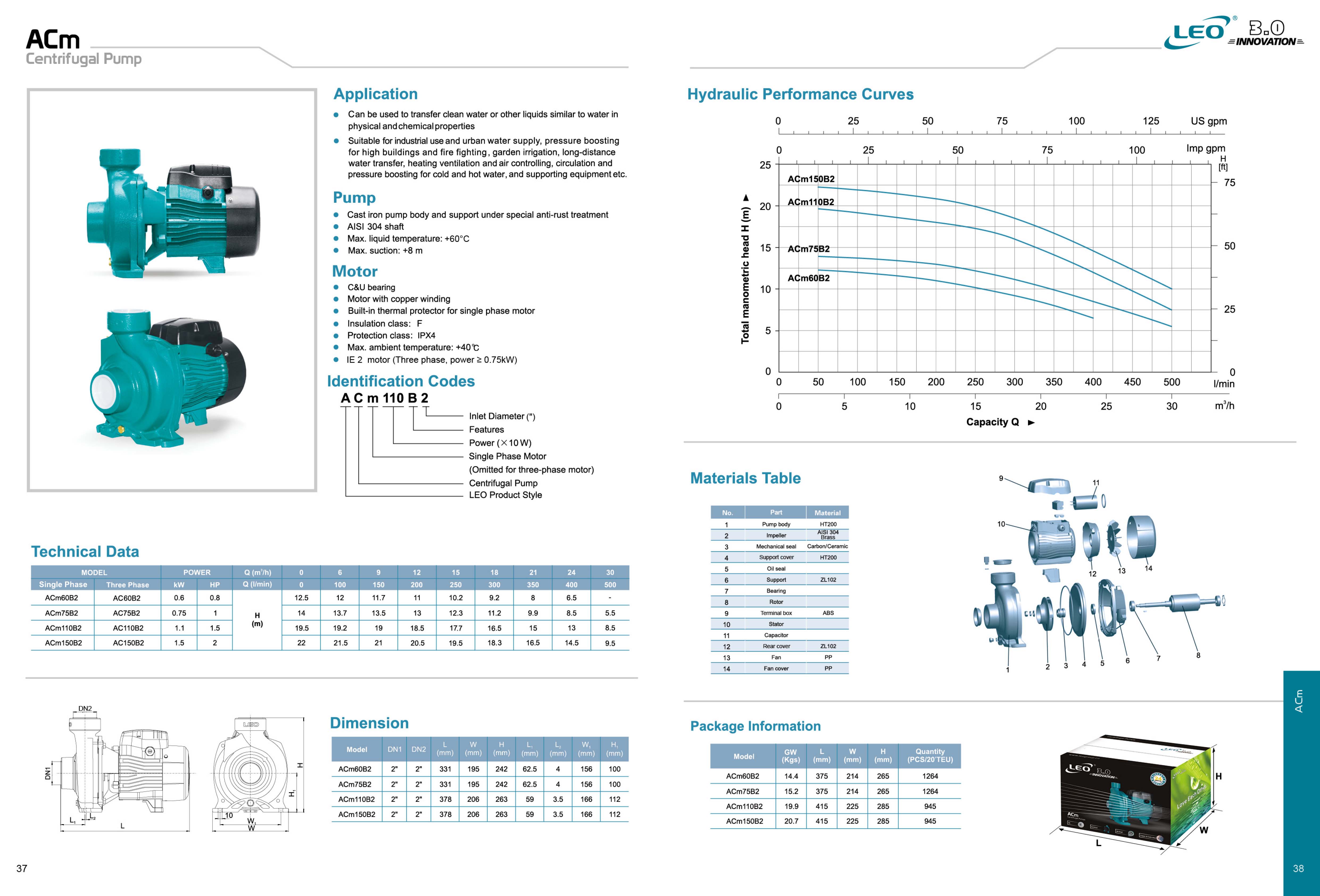 این پمپ ها در توان های مختلف از 0.25 الی 7.5 کیلووات با قابلیت کارکرد با برق سه فاز یا تک فاز تولید می شوند (پمپ های تکفاز در نام گذاری با نام ACm مشخص می گردند) و حداکثر آبدهی این پمپ ها تا 96 متر مکعب بر ساعت و حداکثر ارتفاع هد تا 56 متر می باشد، این پمپ ها در صورت نصب صحیح قادر به مکش آب از چاه ها یا استخر هایی با عمق حداکثر 8 متر را دارند.