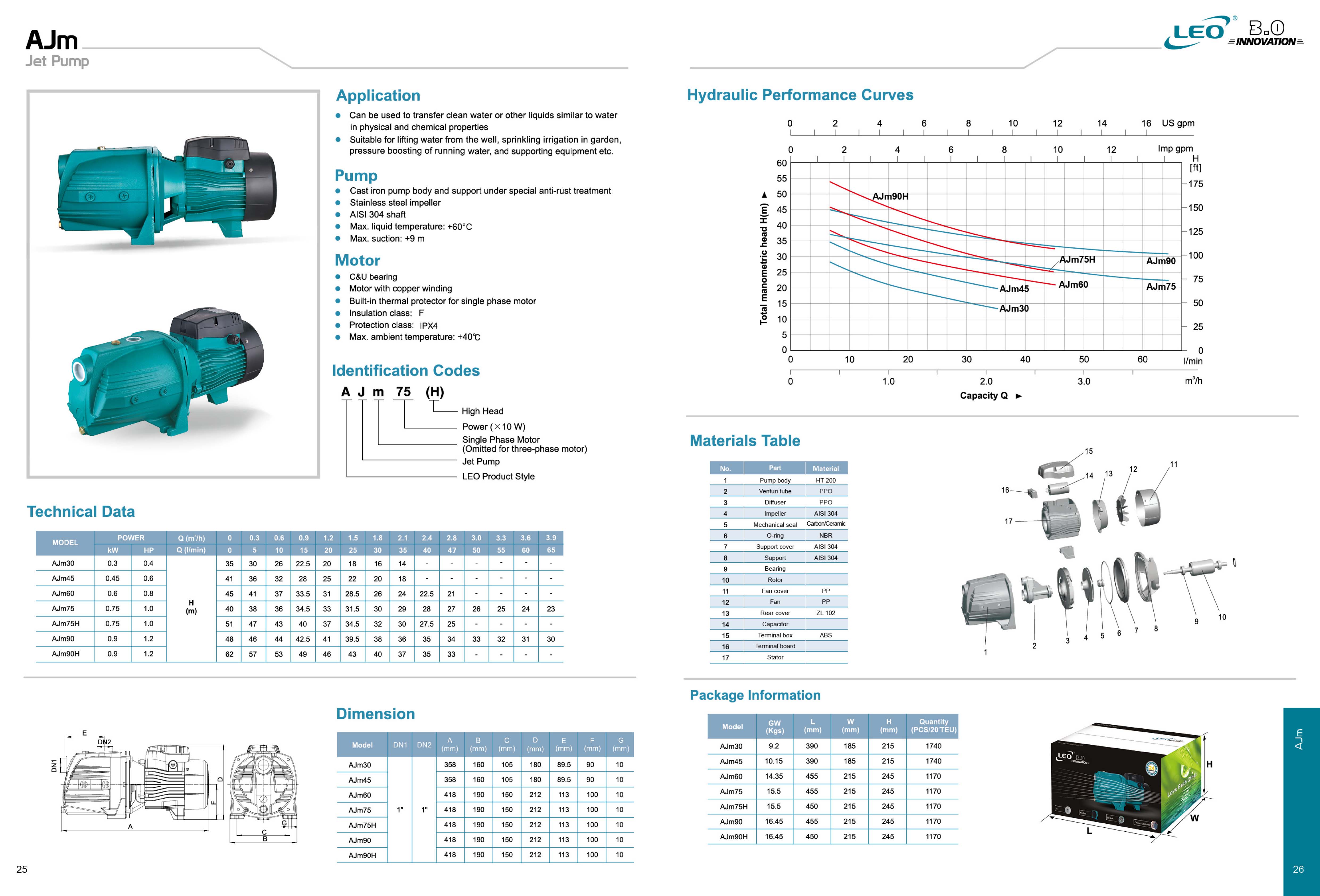 پمپ های جتی (Jet Pump) یکی از انواع مدل های پرکاربرد پمپ ها می باشند که در برند لیو با نام AJm نام گذاری شده اند، این پمپ ها برای انتقال آب تمیز و سایر سیالات مشابه آب در خواص فیزیکی و شیمیایی قابل استفاده می باشند و در مصارف گوناگونی از جمله آبرسانی ساختمانی، سیستم های آبیاری بارانی تحت فشار، آبیاری باغات و مزارع، تخلیه آب از چا ها و حوضچه های کم عمق (حداکثر عمق 9 متر) و .... استفاده می شوند.