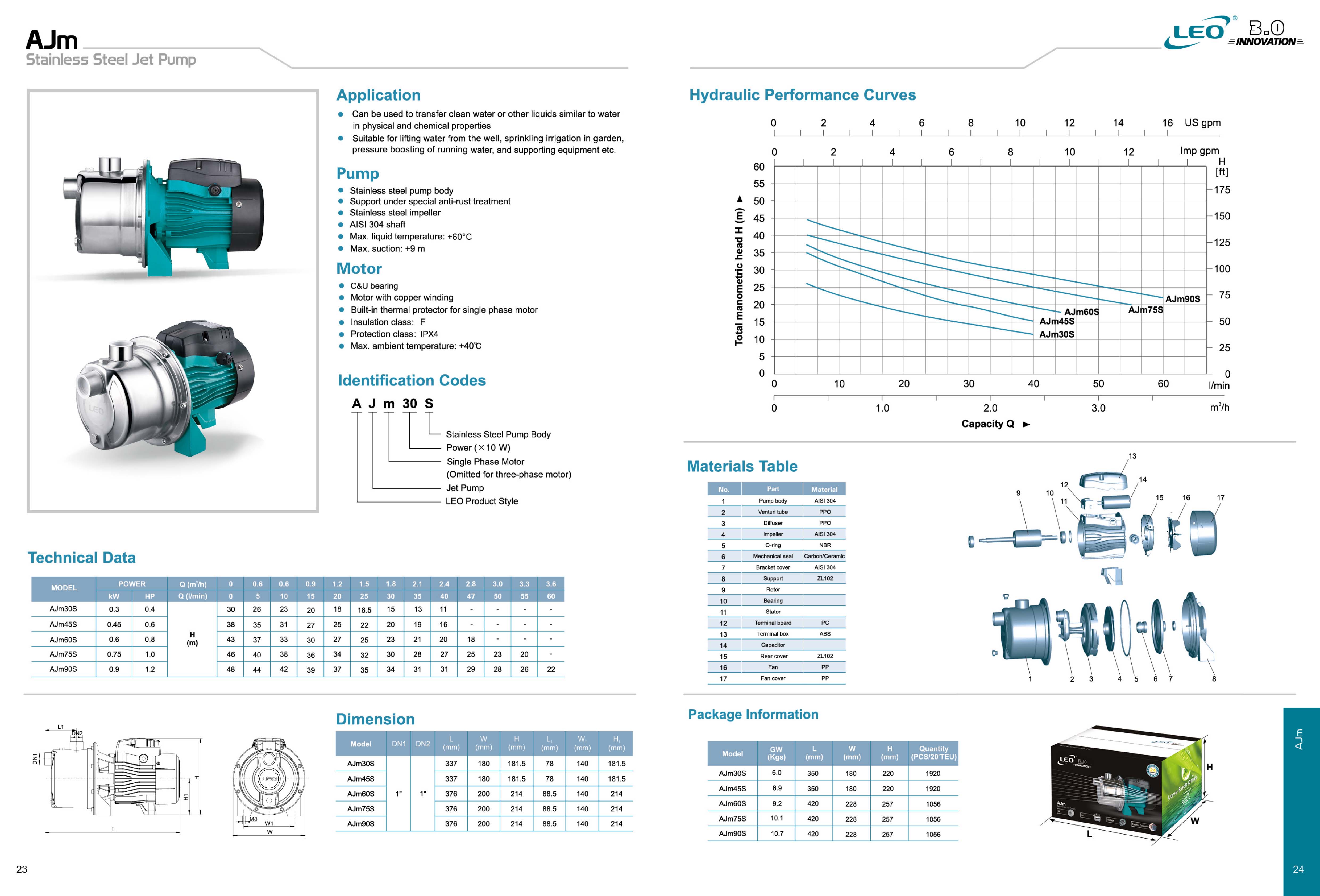 اندازه لوله خروجی این پمپ ها 1 اینچ می باشد و با توان 0.3 تا 1.5 کیلو وات در برند لیو تولید می شوند که با برق تکفاز کار می کنند، حداکثر ارتفاع (هد) این پمپ ها 72 متر می باشد و میزان آبدهی تا حداکثر 8.4 متر مکعب در ساعت ( 140 لیتر در دقیقه) می باشد، اگر از این پمپ برای تخلیه حوضچه ها و چاه ها استفاده گردد در صورت نصب صحیح می توان آب را از عمق حداکثر 9 متر تخلیه نمود.