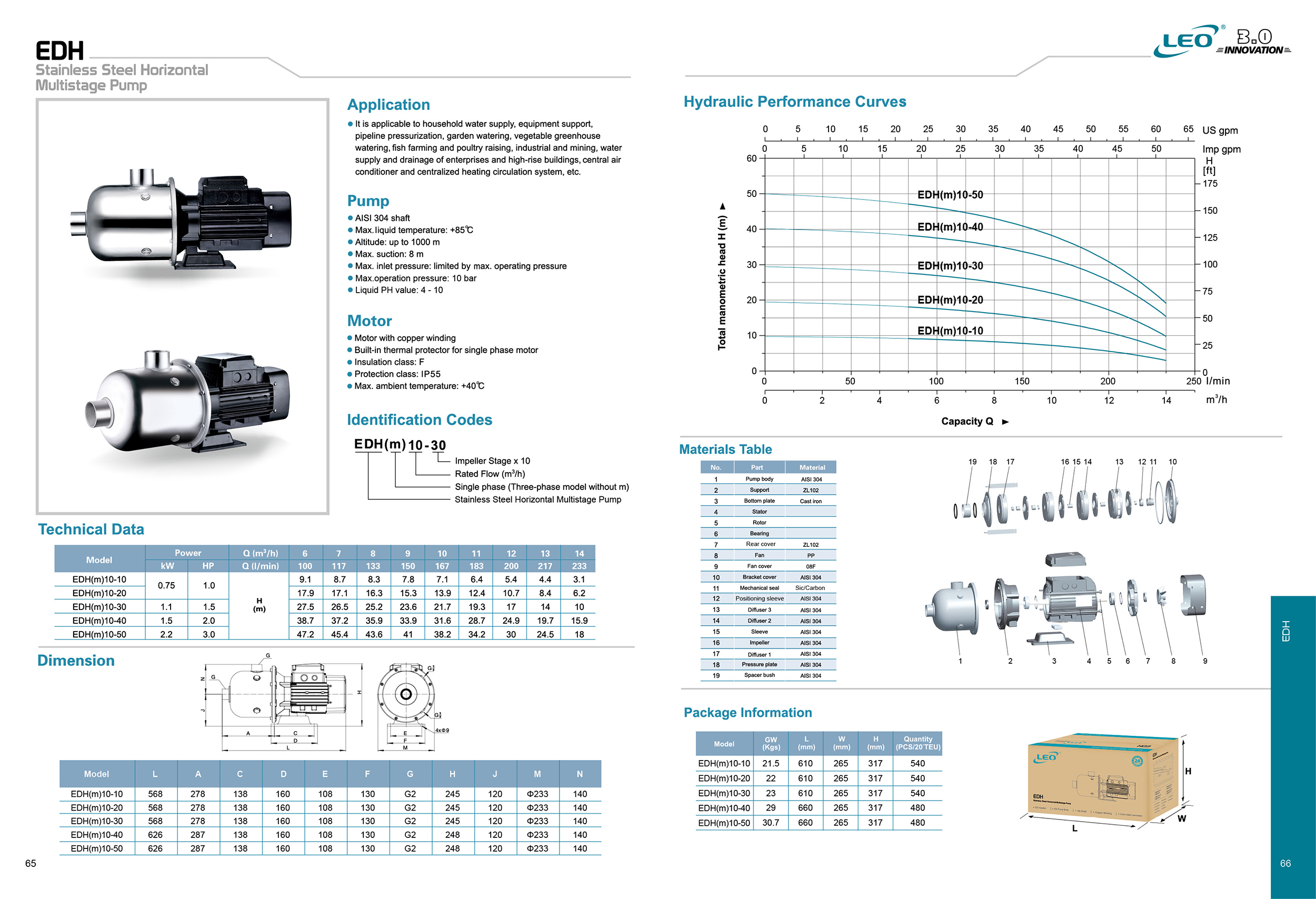 پمپ های edh لیو از نوع پمپ های سانتریفیوژ افقی طبقاتی می باشند، که در آنها از چند پروانه برای پمپاژ سیال استفاده شده است و تعداد  این پروانه ها از 2 الی 6 عدد بسته به مدل متغیر می باشد، به دلیل استفاده از چند پروانه در این پمپ ها امکان دستیابی به فشار خروجی بیشتر نسبت به پمپ های تک پروانه با توان مشابه وجود دارد.