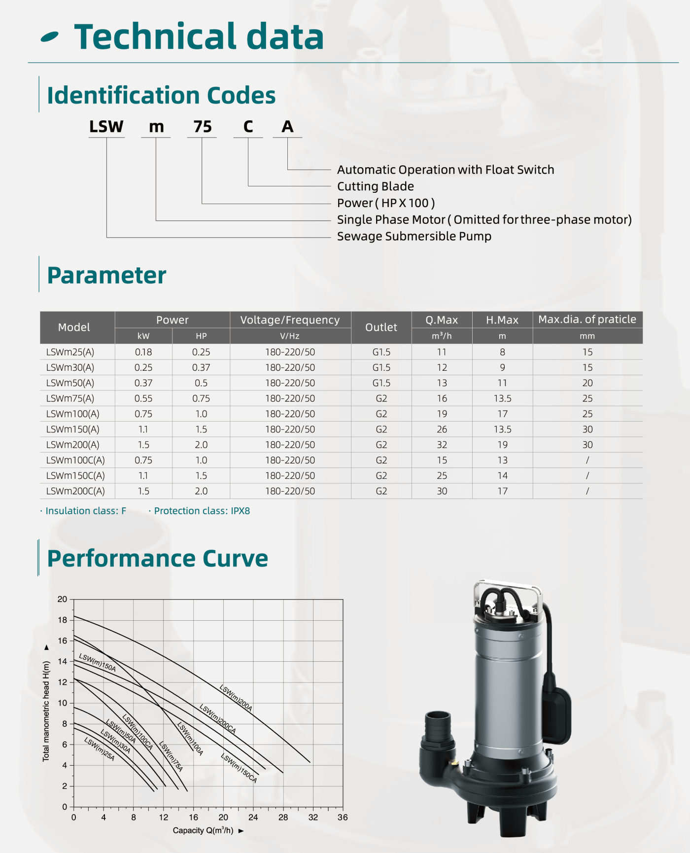الکترو پمپ های لجن کش از نوع پمپ های سانتریفیوژ جهت انتقال سیالاتی همراه با ذرات جامد و معلق مثل آب های گل آلود و فاضلاب های صنعتی و خانگی، مایعات حاوی ذرات معلق و الیاف های بلند که این نوع پمپ ها برای آبهای آلوده، آبهای گل آلود و سیالاتی که دارای ذرات سایشی و غیره هستند مناسب استفاده می باشند، که به صورت مستغرق درون سیال قرار می گیرند . سری LSWm با پوسته چدن و پروانه استیل از مقاومت و کارکرد بالایی در پروژه های خانگی ساختمانی صنعتی و کارخانجات و تصفیه فاضلاب برخوردار است .
