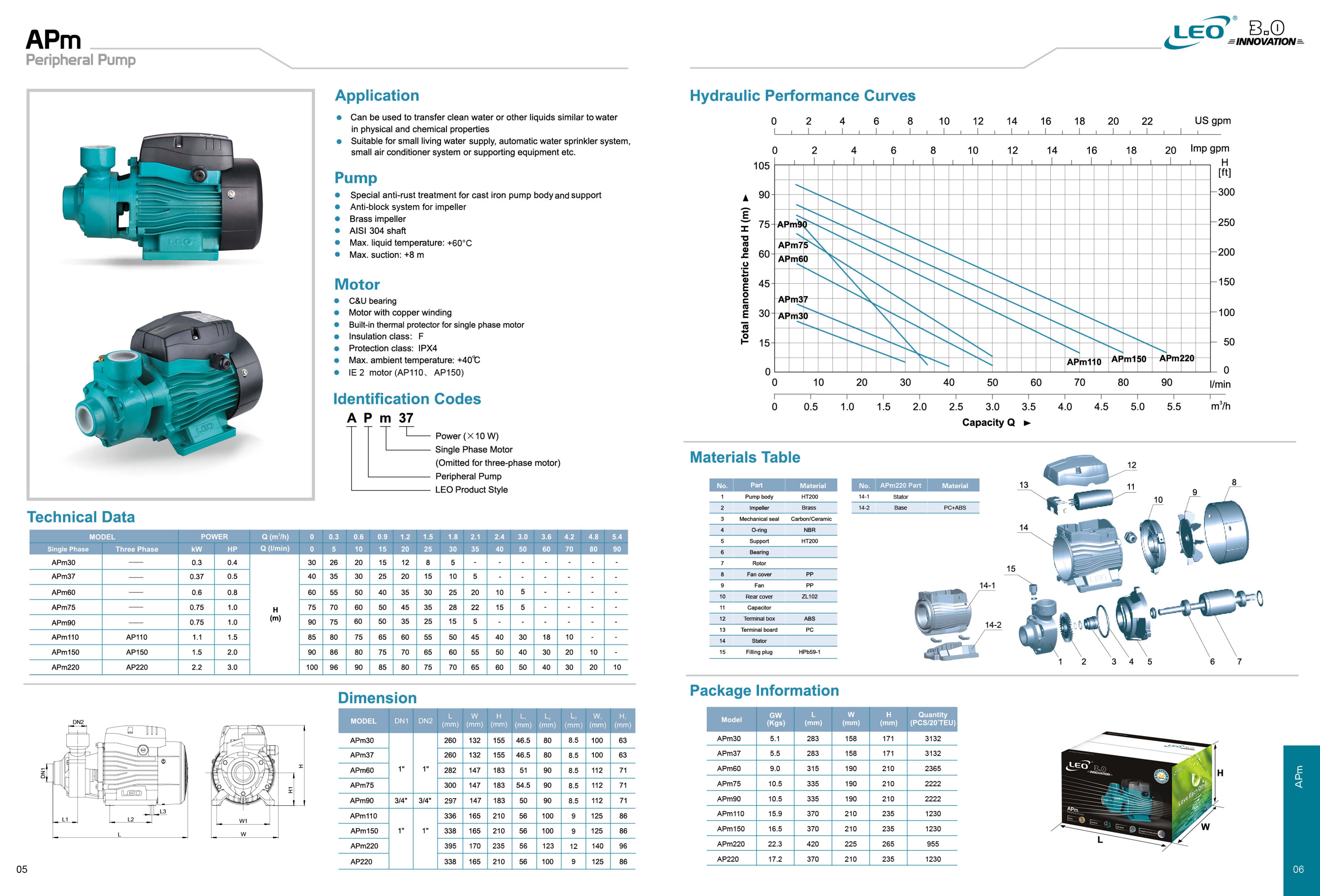 از نظر جنس قطعات در این پمپ ها شرکت لیو سعی بر این نموده که از بهترین متریال با بالاترین سطح استاندارد روز دنیا استفاده نماید، جنس بدنه این پمپ ها از چدن ضد زنگ HT200 می باشد که به جهت جلوگیری از زنگ زدگی توسط عملیات الکتروفریوز (رنگ آمیزی ضد زنگ محصول به کمک نیروی مغناطیسی) ضد زنگ شده اند و مقاومت بسیار خوبی در مقابل زنگ زدگی حتی در محیط هایی با رطوبت بالا دارد، پروانه این مدل پمپ از برنج ساخته شده و به دلیل نوع خاص پروانه و بدنه پمپ و فاصله کم آنها از یکدیگر، در قسمت داخلی و دو طرف پروانه از قطعات برنجی استفاده شده است، علت استفاده از این قطعات جلوگیری از تجمع زنگ زدگی و ذرات ناخالصی بین پروانه و بدنه پمپ در زمان هایی که برای مدتی از پمپ استفاده نمی شود می باشد و در نهایت این ساختار مانع از گرفتگی و قفل کردن پمپ می گردد، و عمر محصول را به صورت قابل ملاحظه ای افزایش می دهد.