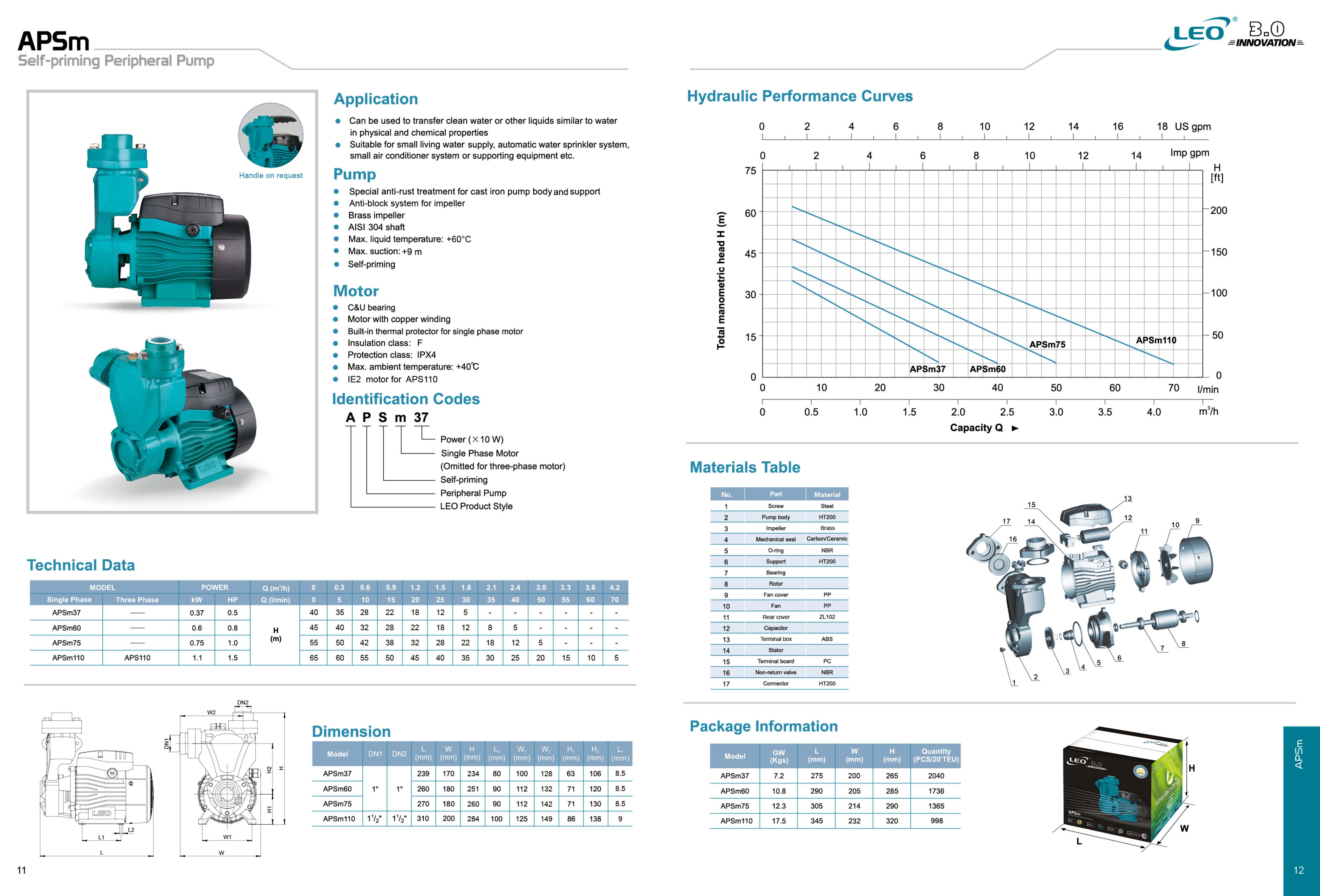 از نظر جنس قطعات در این پمپ ها شرکت لیو سعی بر این نموده که از بهترین متریال با بالاترین سطح استاندارد روز دنیا استفاده نماید، جنس بدنه این پمپ ها از چدن ضد زنگ HT200 می باشد که به جهت جلوگیری از زنگ زدگی توسط عملیات الکتروفریوز (رنگ آمیزی ضد زنگ محصول به کمک نیروی مغناطیسی) ضد زنگ شده اند و مقاومت بسیار خوبی در مقابل زنگ زدگی حتی در محیط هایی با رطوبت بالا دارد، پروانه این مدل پمپ از برنج ساخته شده و به دلیل نوع خاص پروانه و بدنه پمپ و فاصله کم آنها از یکدیگر، در قسمت داخلی و دو طرف پروانه از قطعات برنجی استفاده شده است، علت استفاده از این قطعات جلوگیری از تجمع زنگ زدگی و ذرات ناخالصی بین پروانه و بدنه پمپ در زمان هایی که برای مدتی از پمپ استفاده نمی شود می باشد و در نهایت این ساختار مانع از گرفتگی و قفل کردن پمپ می گردد، و عمر محصول را به صورت قابل ملاحظه ای افزایش می دهد.