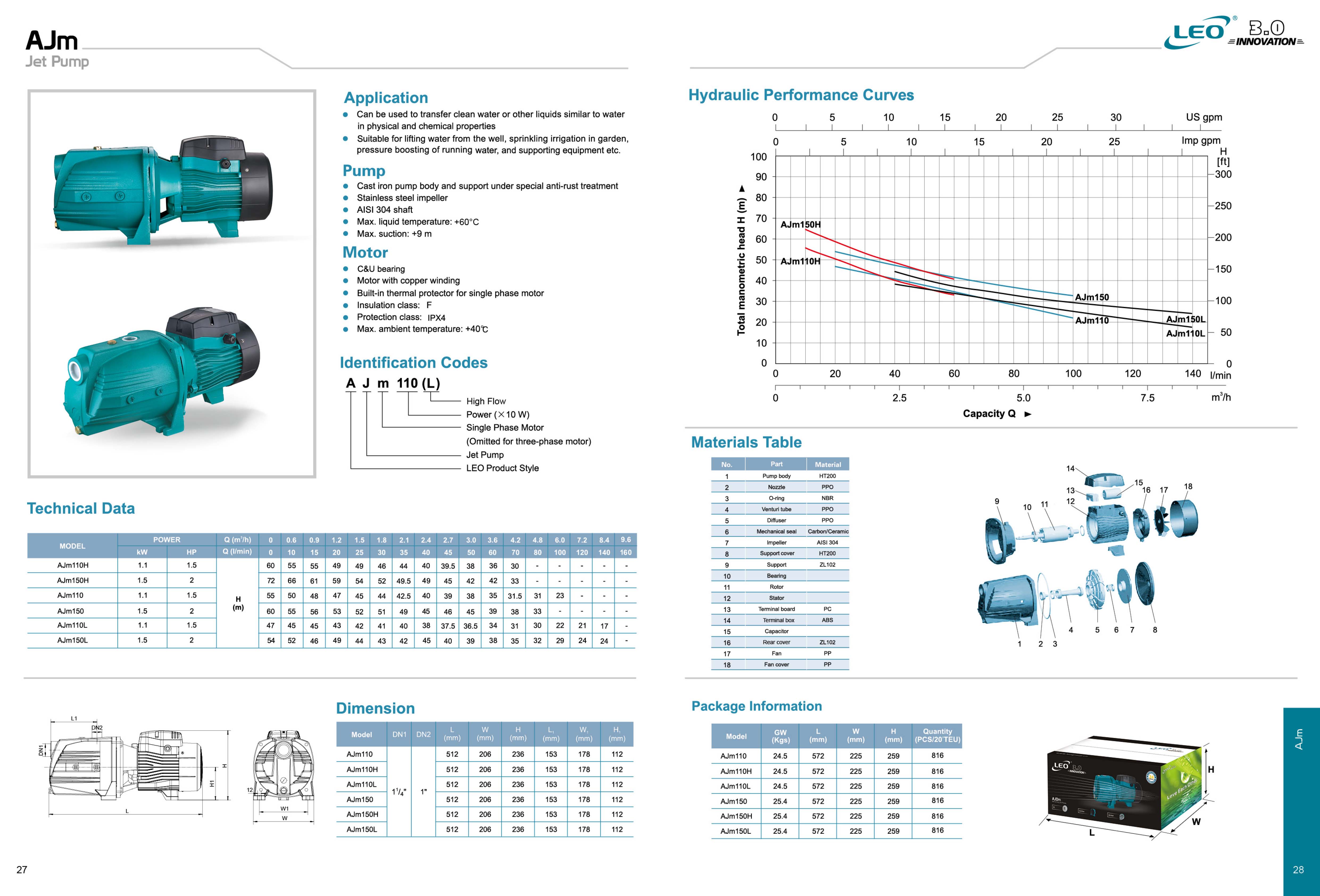 پمپ های جتی (Jet Pump) یکی از انواع مدل های پرکاربرد پمپ ها می باشند که در برند لیو با نام AJm نام گذاری شده اند، این پمپ ها برای انتقال آب تمیز و سایر سیالات مشابه آب در خواص فیزیکی و شیمیایی قابل استفاده می باشند و در مصارف گوناگونی از جمله آبرسانی ساختمانی، سیستم های آبیاری بارانی تحت فشار، آبیاری باغات و مزارع، تخلیه آب از چا ها و حوضچه های کم عمق (حداکثر عمق 9 متر) و .... استفاده می شوند.