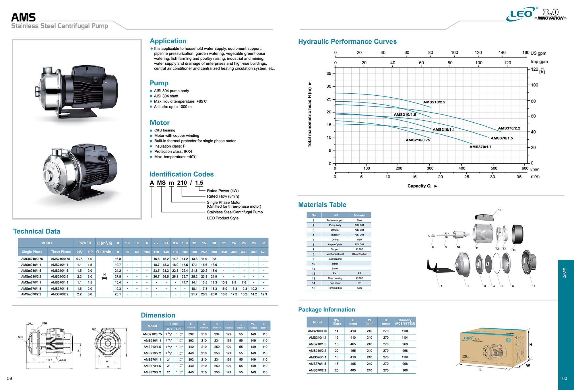 پمپ های AMS از سری پمپ های سانتریفیوژ استنلس استیل ساخت شرکت لیو می باشند که در چند مدل مختلف با برق مصرفی تکفاز و سه فاز (پمپ های تکفاز با نام AMSm مشخص می گردند) توسط این شرکت تولید می گردند، این پمپ ها برای تامین فشار آب مصرفی ساختمان ها، تامین آب در گلخانه ها، استخرهای پرورش ماهی، صنایع غذایی، سیستم های تصفیه آب در هر مکانی که امکان استفاده از پمپ های چدنی نباشد و نیاز به سطح پاکیزگی بالاتری نسبت به پمپ های چدنی می باشد مورد استفاده می باشند و برای پمپاژ آب و سیالاتی با سطح خورندگی پایین که آسیبی به استنلس استیل 304 وارد نمی کنند مناسب می باشند (در صورت استفاده برای سیالاتی که دارای خورندگی می باشند نیاز به تاییدیه کتبی بخش فنی این شرکت می باشد)، حداکثر دمای مجاز سیال در این محصول 85 درجه سانتیگراد می باشد.