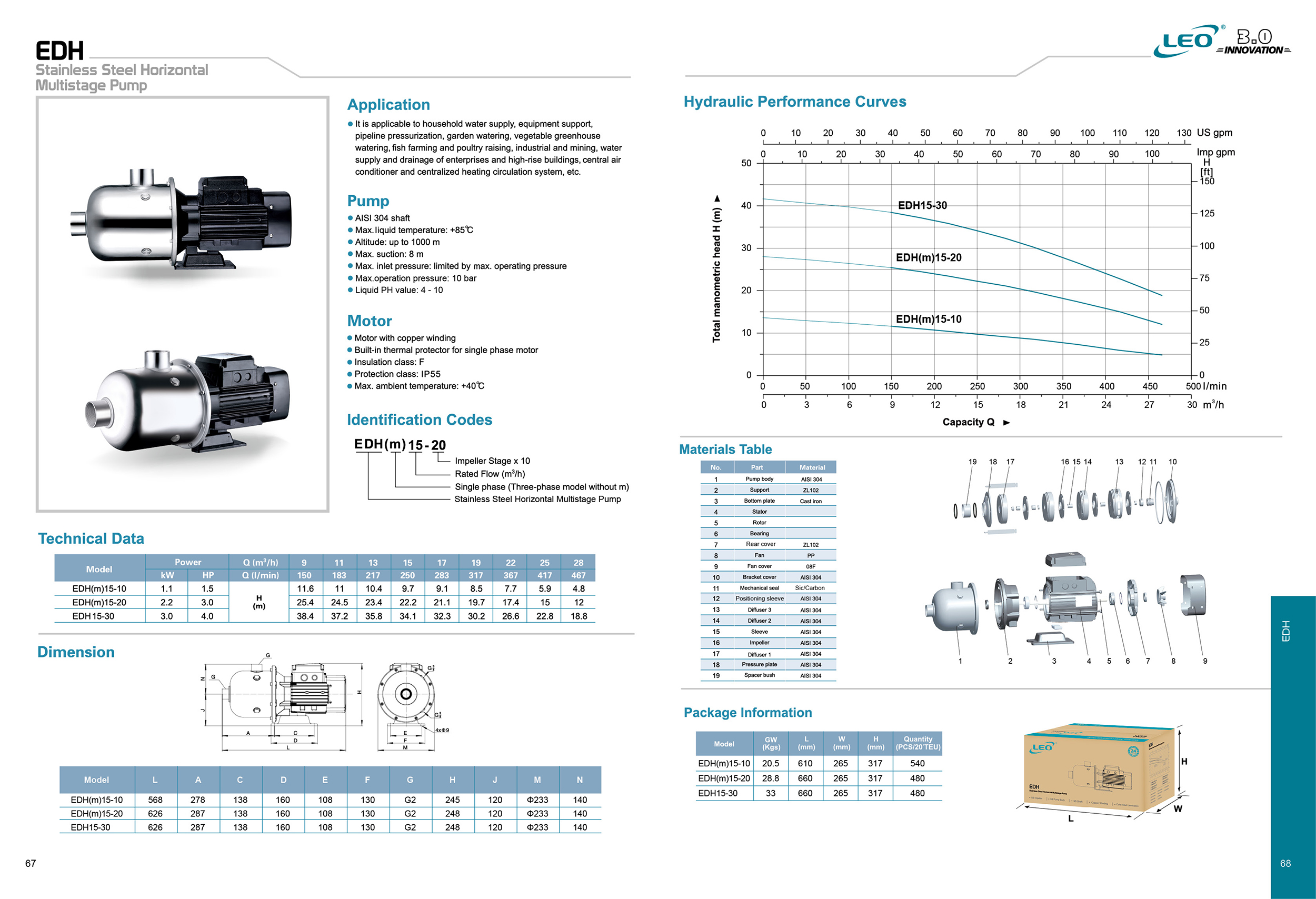 پمپ های edh لیو از نوع پمپ های سانتریفیوژ افقی طبقاتی می باشند، که در آنها از چند پروانه برای پمپاژ سیال استفاده شده است و تعداد این پروانه ها از 2 الی 6 عدد بسته به مدل متغیر می باشد، به دلیل استفاده از چند پروانه در این پمپ ها امکان دستیابی به فشار خروجی بیشتر نسبت به پمپ های تک پروانه با توان مشابه وجود دارد.